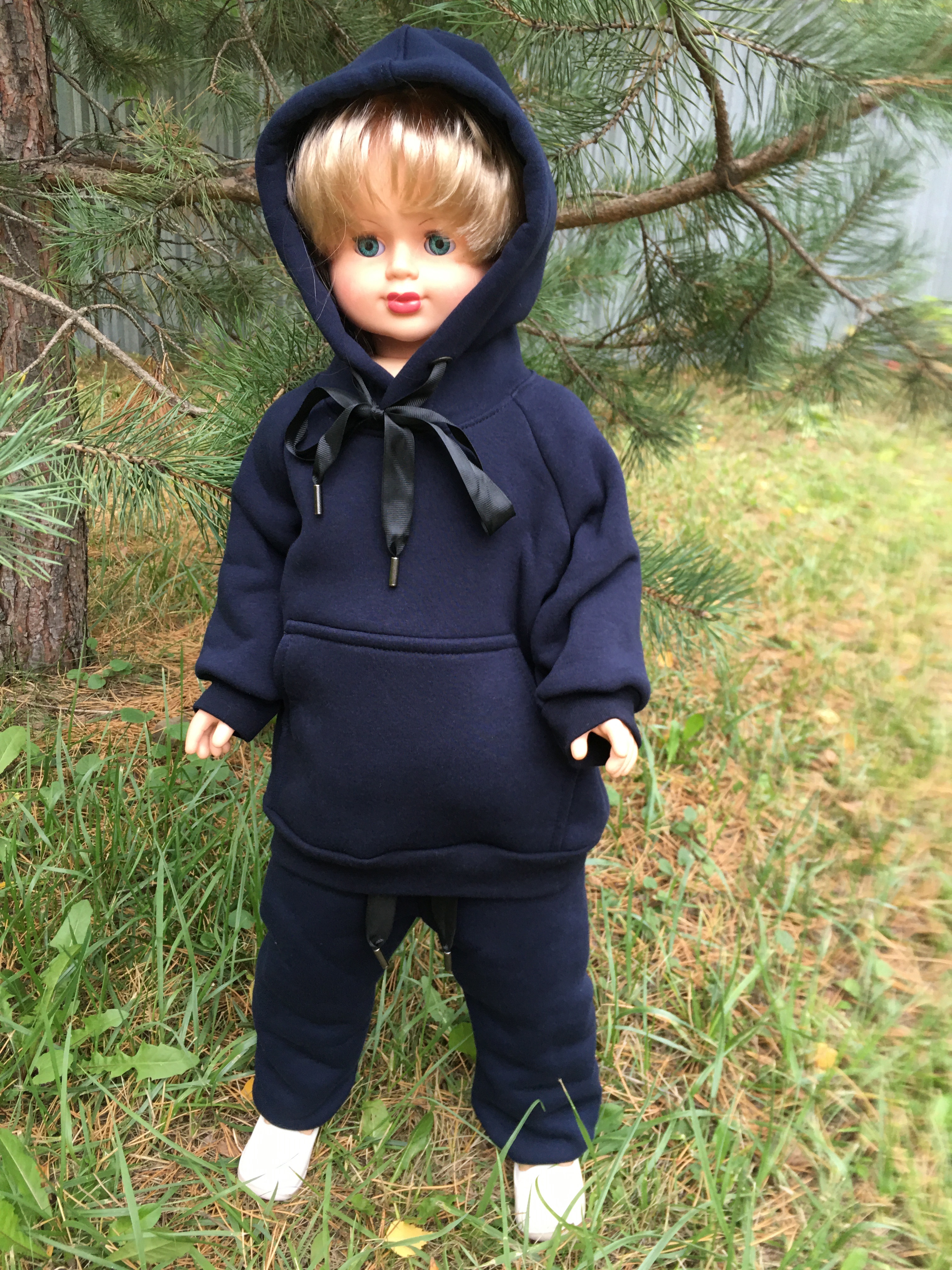 Костюм выполнен из футера трёхнитки с начёсом. Костюм состоит из толстовки с капюшоном, спереди с карманом "кенгуру", на рукавах манжеты. В комплект входят брюки сверху на широкой резинки, снизу на манжетах. Толстовка декорированы шнурком.