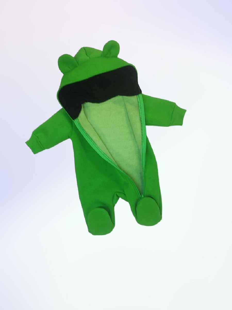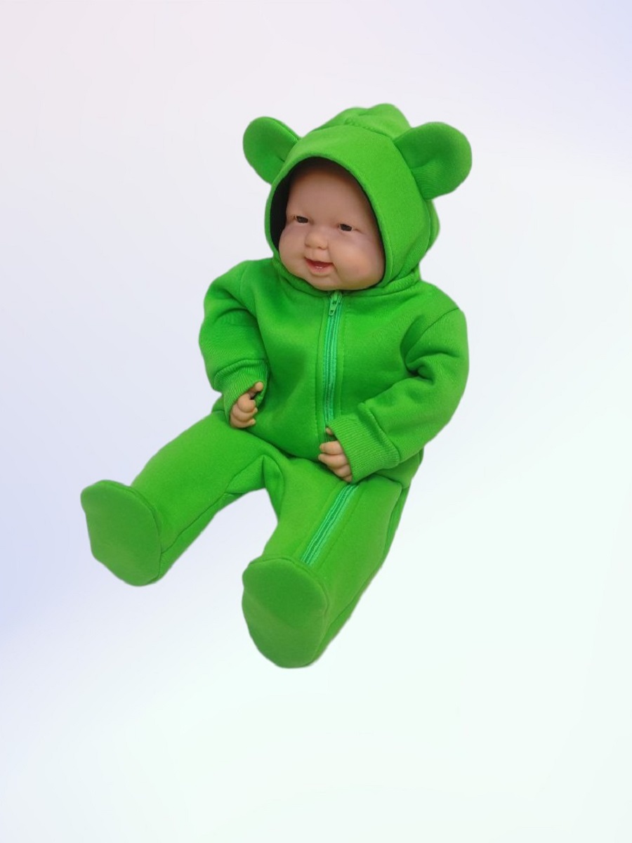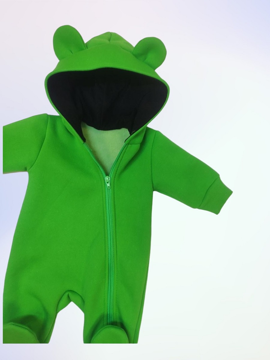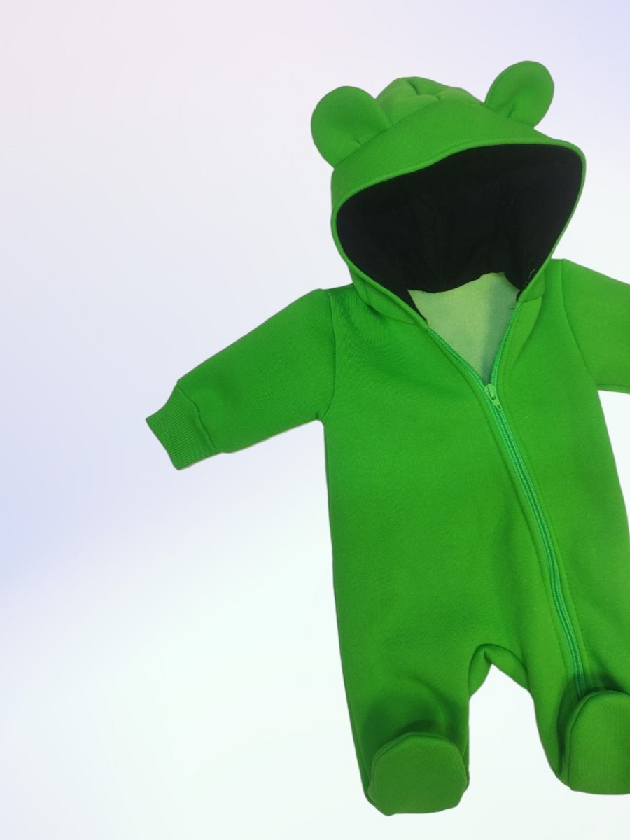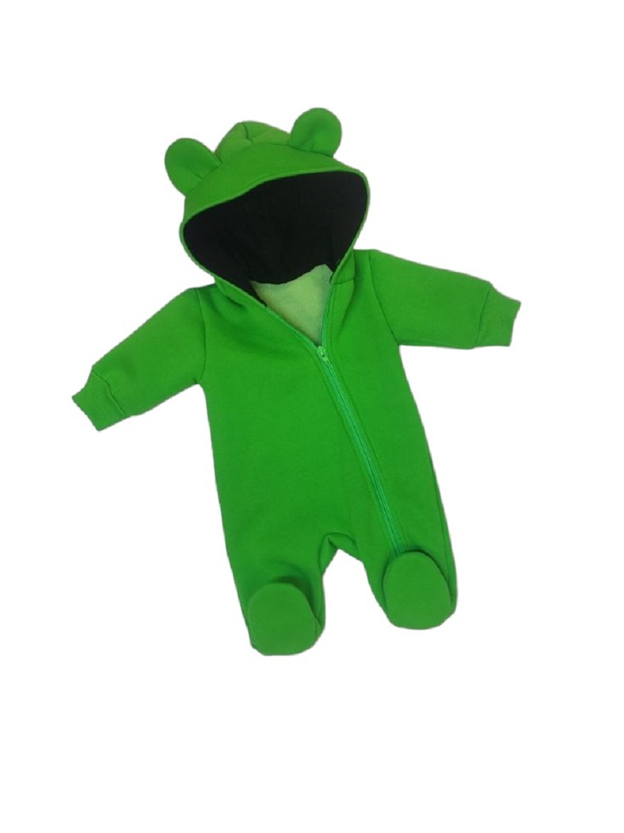 Комбинезон выполнен из футера двухнитки с начёсом. Спереди косая молния, капюшон на подкладке. У комбинезона закрытые ножки, на рукавах манжеты.